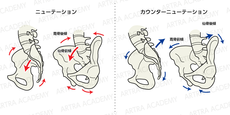 仙骨にはニューテーション(うなずき運動)とカウンターニューテーション(反うなずき運動/起き上がり運動)という動きがあります。寛骨に対して仙骨が前傾する動きがニューテーション、寛骨に対して仙骨が後傾する動きがカウンターニューテーションといいます。