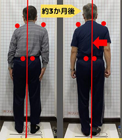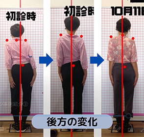 長く腰痛に悩まされ、他院に6年間通院したが治らなかった。ひどい腰痛で前屈み姿勢になる。足のだるさがあり、5分以上は自力で立てなかったが、約2週間後には本人から「体を伸ばしやすい」と笑顔が見られた。