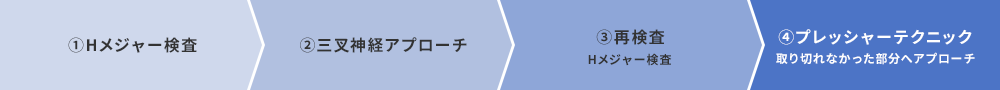 TNブレインで必ず行う「Hメジャー検査」を実施した上で三叉神経(脳=3次)にアプローチし、取り切れなかった部分に対して行うテクニック(筋=1次)になります。